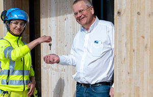 Amanda Broberg från Byggpartner lämnar över nyckeln till Gunnar Jönsson som nu kan flytta in.